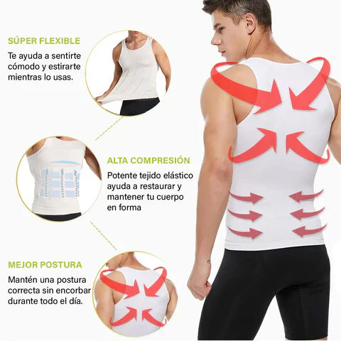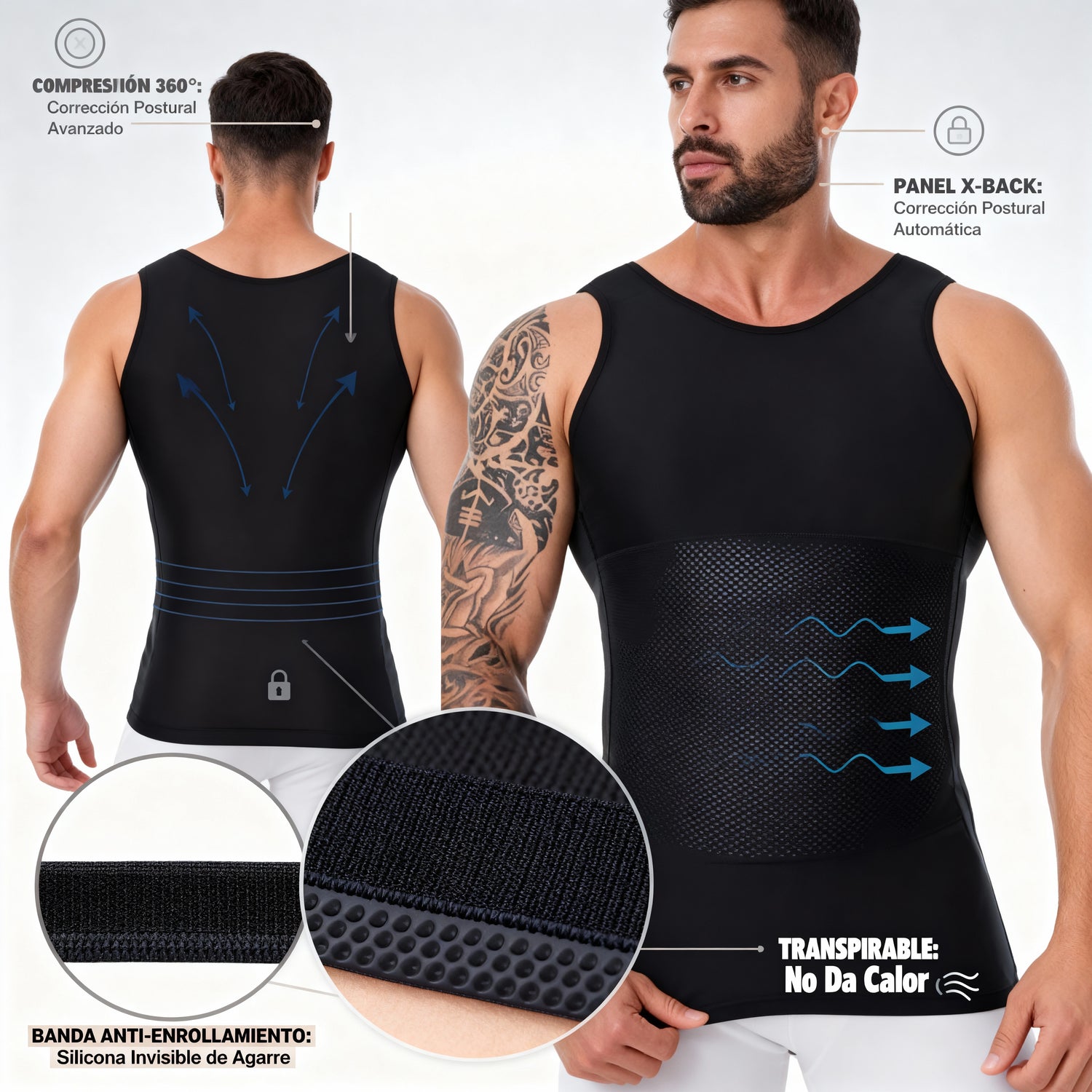 Compresión 360°: Tejido de polímero avanzado que oculta la ginecomastia y reduce la cintura visualmente.